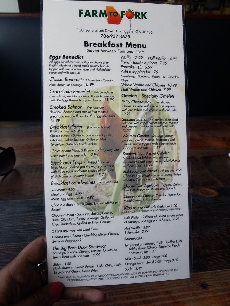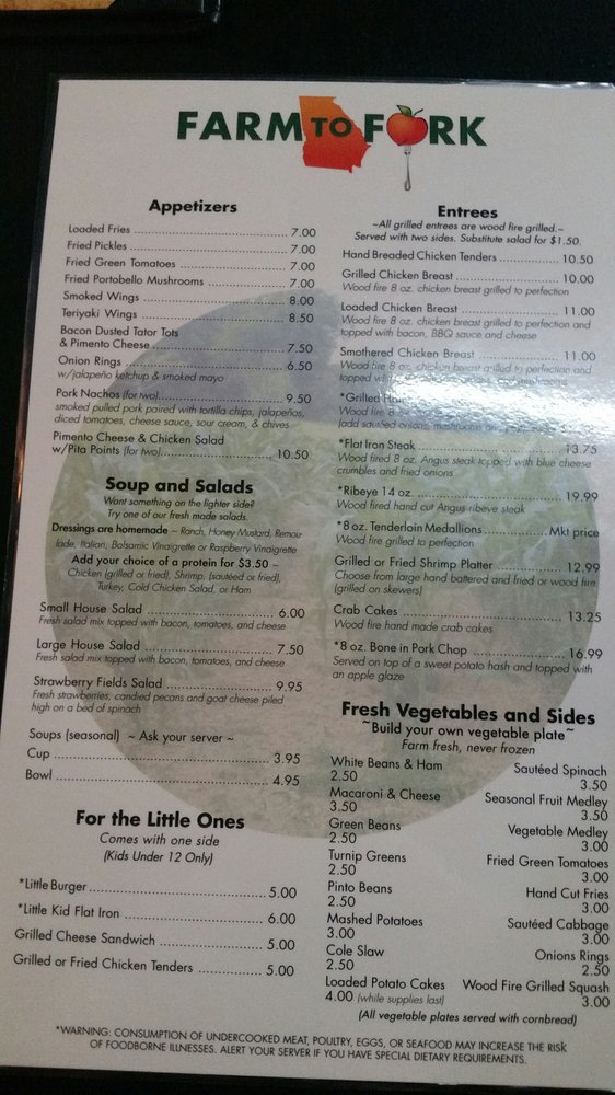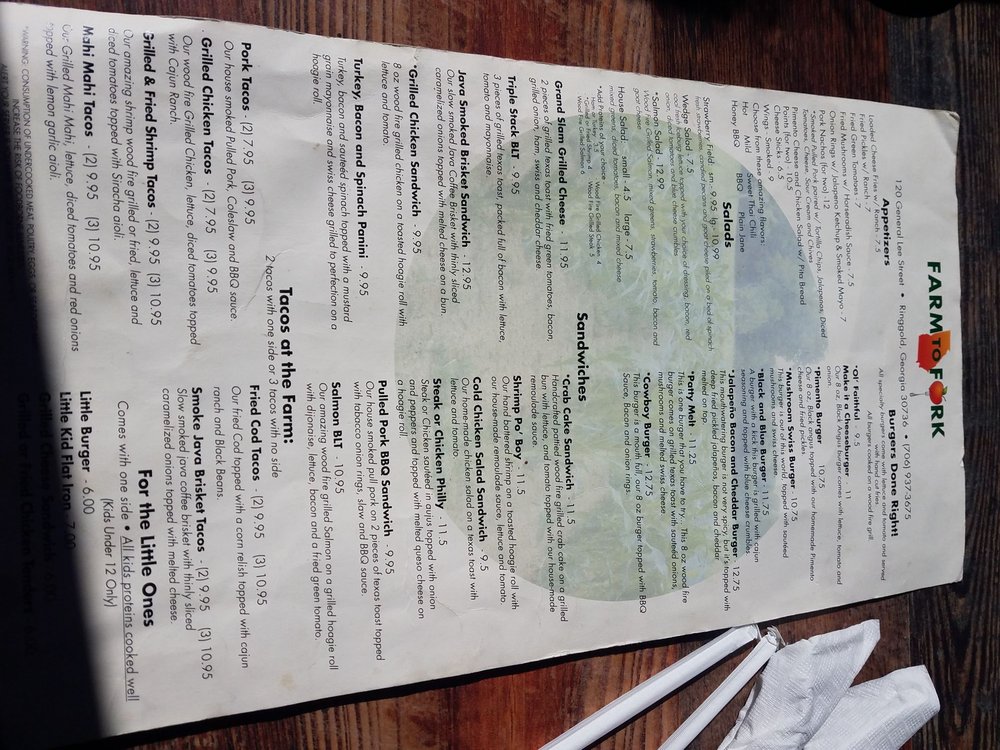 "Introducing the menu at Farm To Fork, a charming American restaurant in Ringgold, GA, featuring a delightful mix of Breakfast & Brunch and Steakhouse options. This cozy spot offers a range of amenities including reservations, delivery, takeout, and even Keto and vegetarian options. With a casual ambiance and friendly service, Farm To Fork is perfect for groups, families, and even pets are welcome on the outdoor patio. The menu boasts mouthwatering appetizers like Bacon Dusted Tots and Fried Green Tomatoes, along with hearty handhelds such as the Cajun Philly and Farm Burger. Don't miss out on their refreshing salads like the House Salad with mixed greens and bacon. Overall, Farm To Fork is a must-visit destination for delicious meals with a cozy atmosphere."